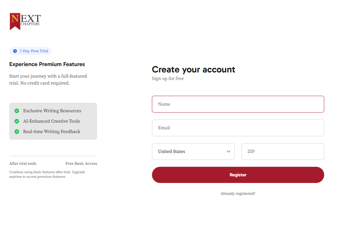 Creating an account on Next Chapters is designed to be straightforward so you can begin using the platform with minimal friction. Signing up does not require a credit card or any payment information if you are creating a free account or using a free trial coupon. Payment details are only collected on our payment processing partner’s page when you choose to pay for a subscription or other services.