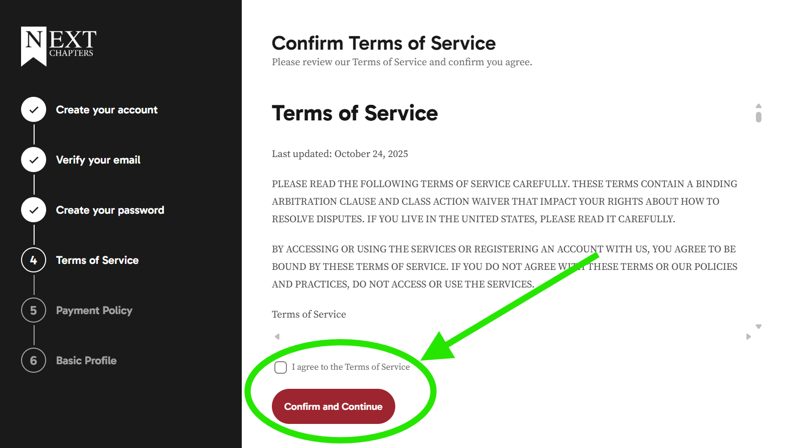 The second screen asks you to review and approve the Terms of Service. These terms explain how the platform works, what is expected of users, and how content is handled within Next Chapters.