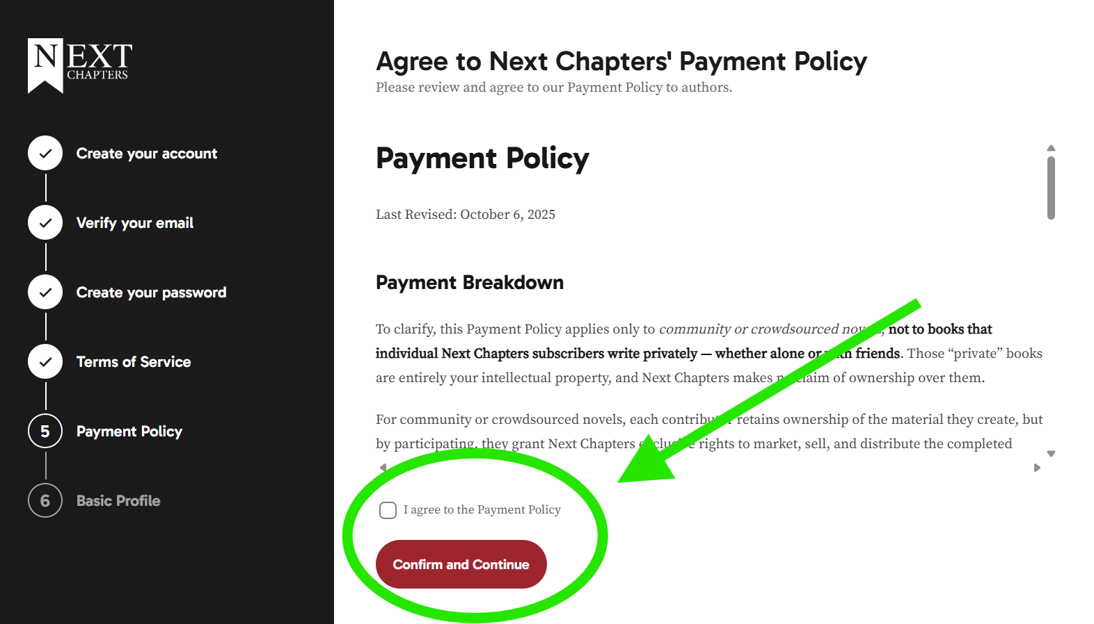 The third screen asks you to review and approve the Author Payment Policy. This policy explains how Next Chapters handles payment and revenue sharing for books written through community and collaborative features on the platform.