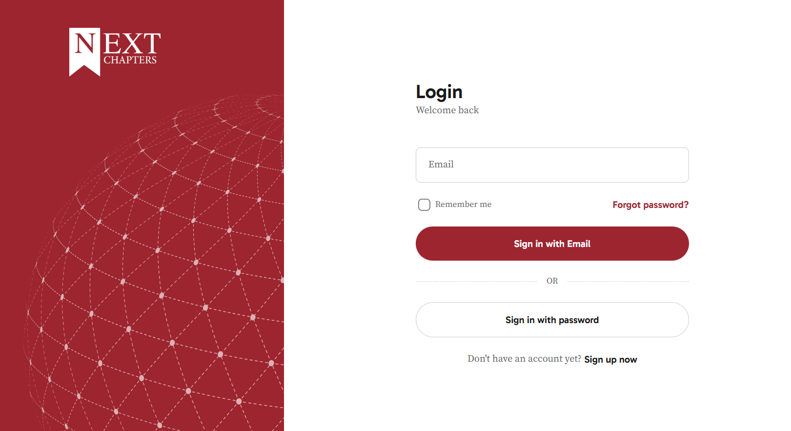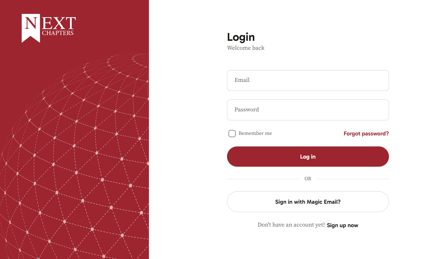Next Chapters offers two ways to log in to your account. By default, the platform uses a one-time login link sent to your email address. If you prefer, you can also choose to log in using your email address and password.