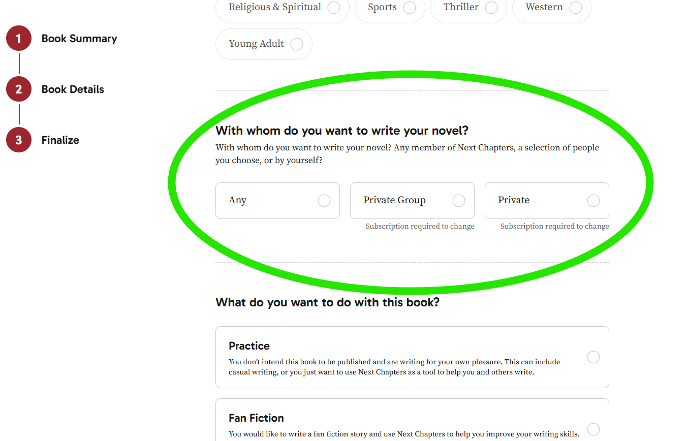 Users with a paid subscription can also create group books and private books. Group books allow invited contributors to work together in a controlled setting, while private books are intended for solo writing.